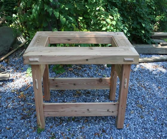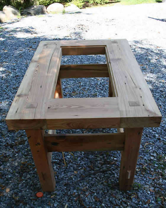 No metal fasteners used. All through mortise and tenon with Black Walnut pegs